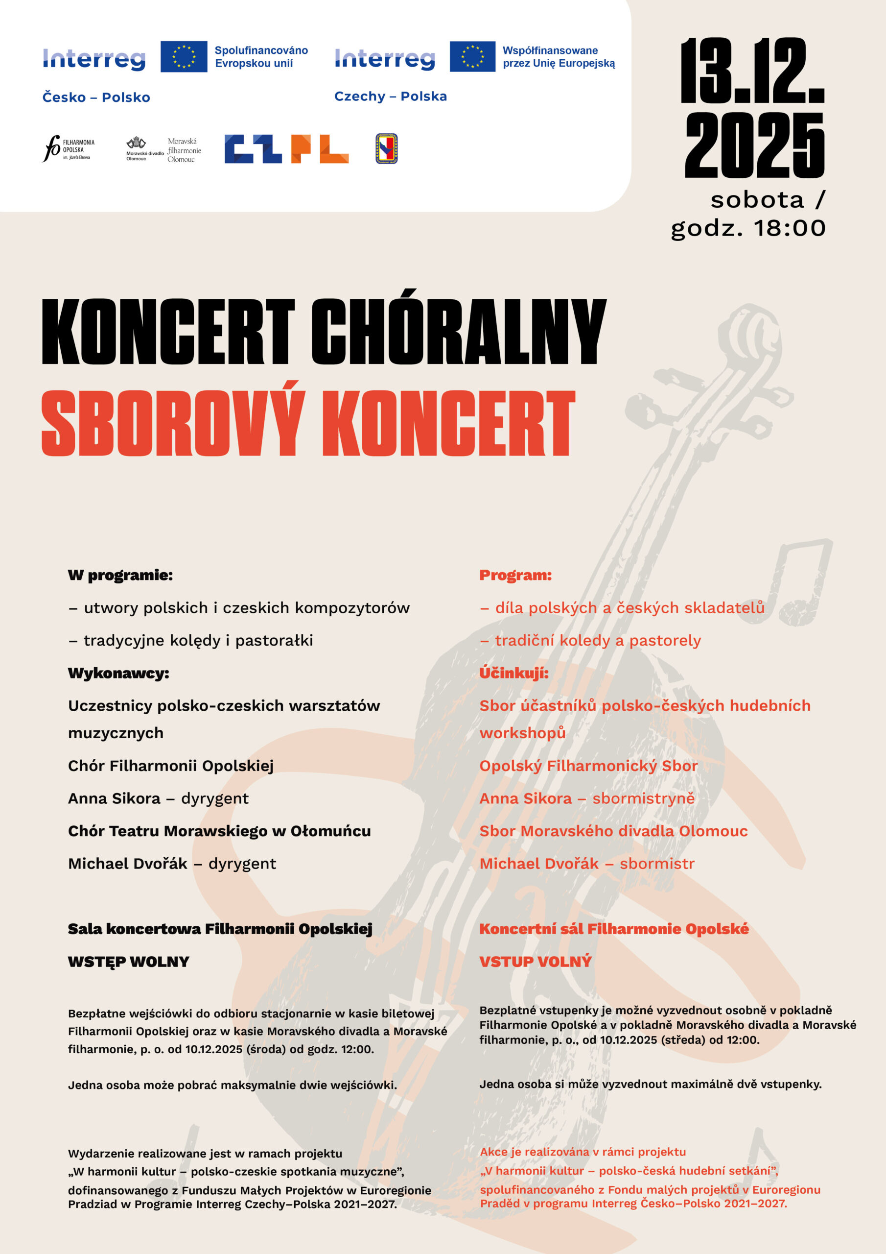 Wydarzenie realizowane jest w ramach projektu „W harmonii kultur – polsko-czeskie spotkania muzyczne”, dofinansowanego z Funduszu Małych Projektów w Euroregionie Pradziad w Programie Interreg Czechy–Polska 2021–2027.